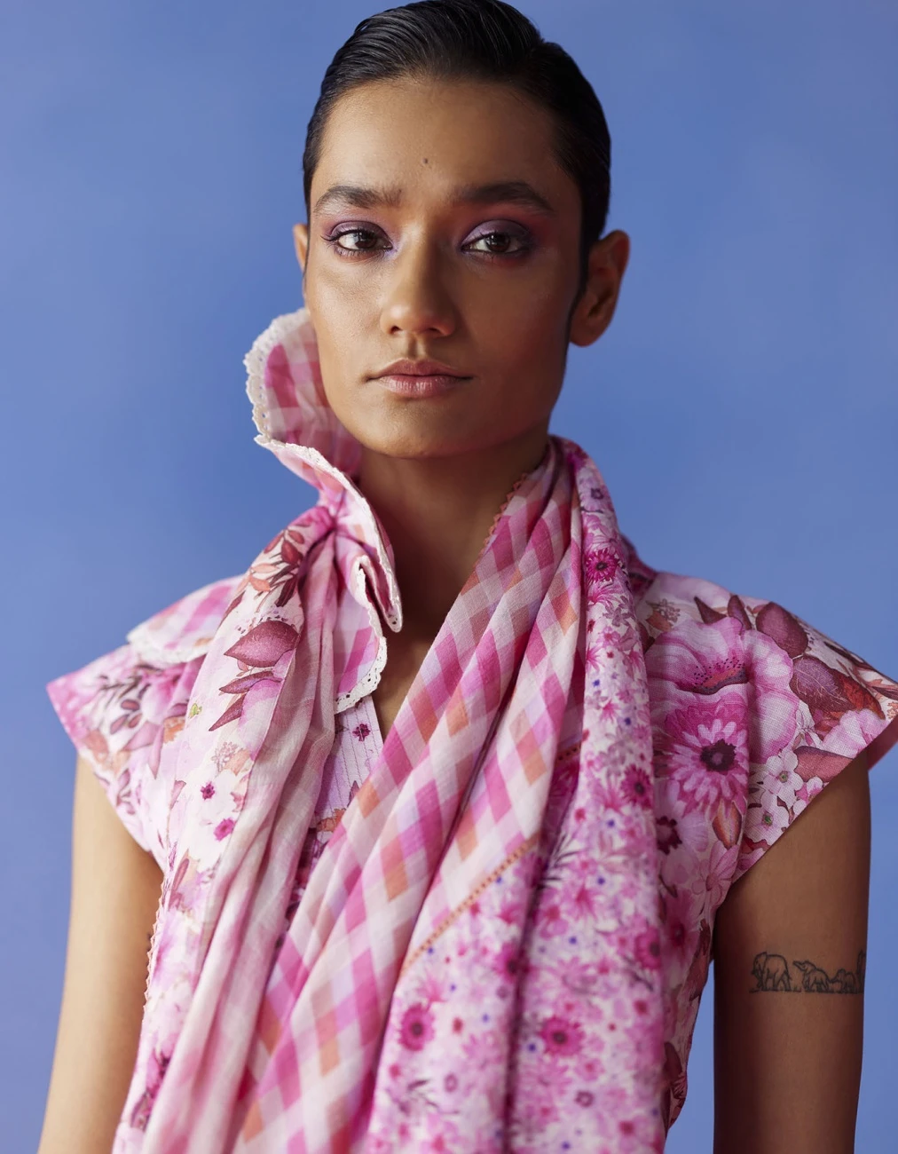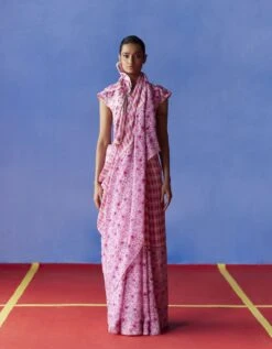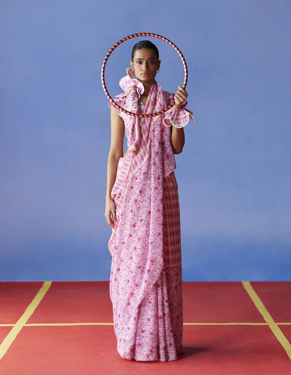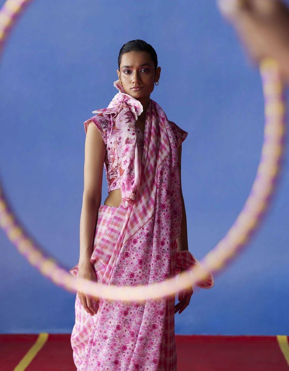 - Pink floral high-collar mantri blouse with quilt details on the neckline