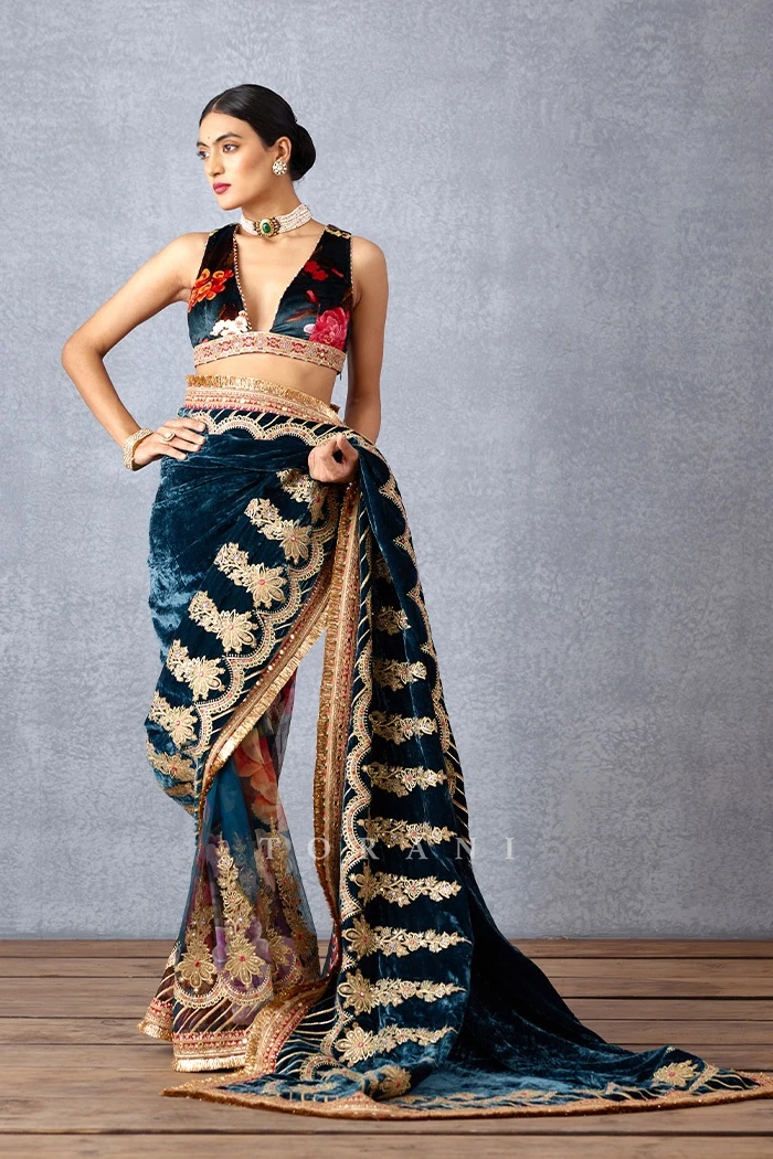 - Navy blue chintz printed elongated v neckline blouse in silk velvet with hand embroidered border