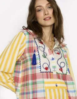 The Checks & Rainbow Striped Top W Hand Embroidered Lobsters On Yoke & Scalloping Detail At Hem