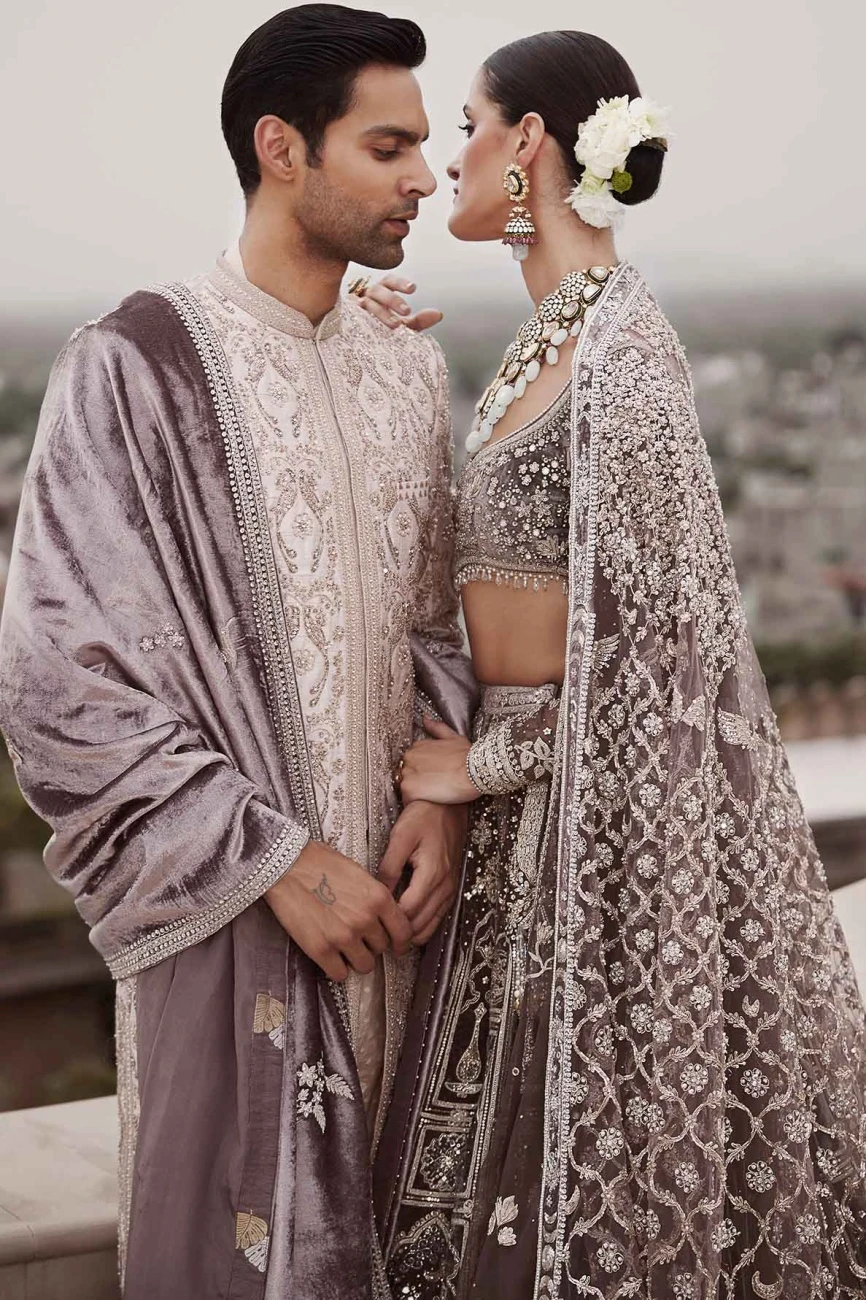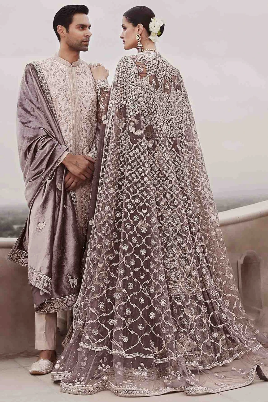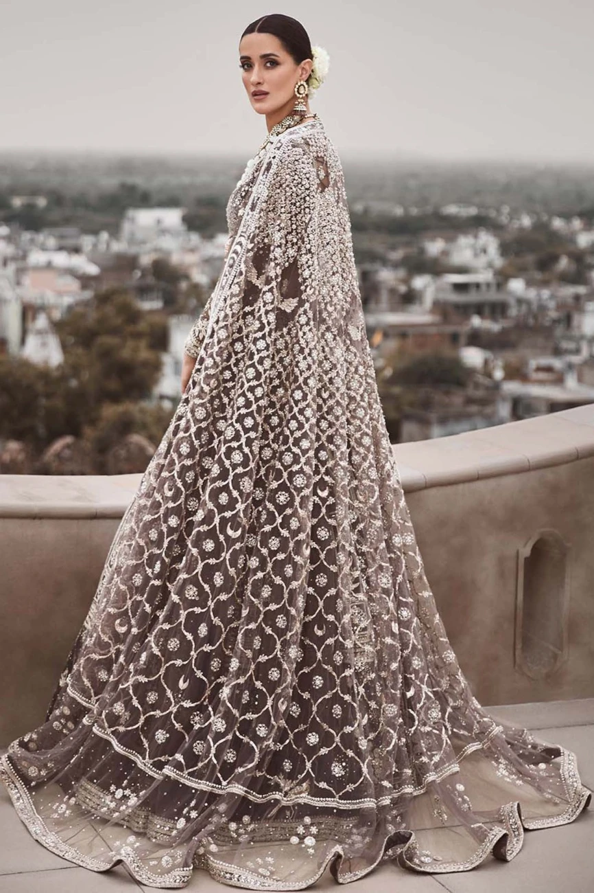 - A chocolate brown shade in velvet, and displays tarnished silver dori work, nakshi, dabka, sequins, and mirror embroidery