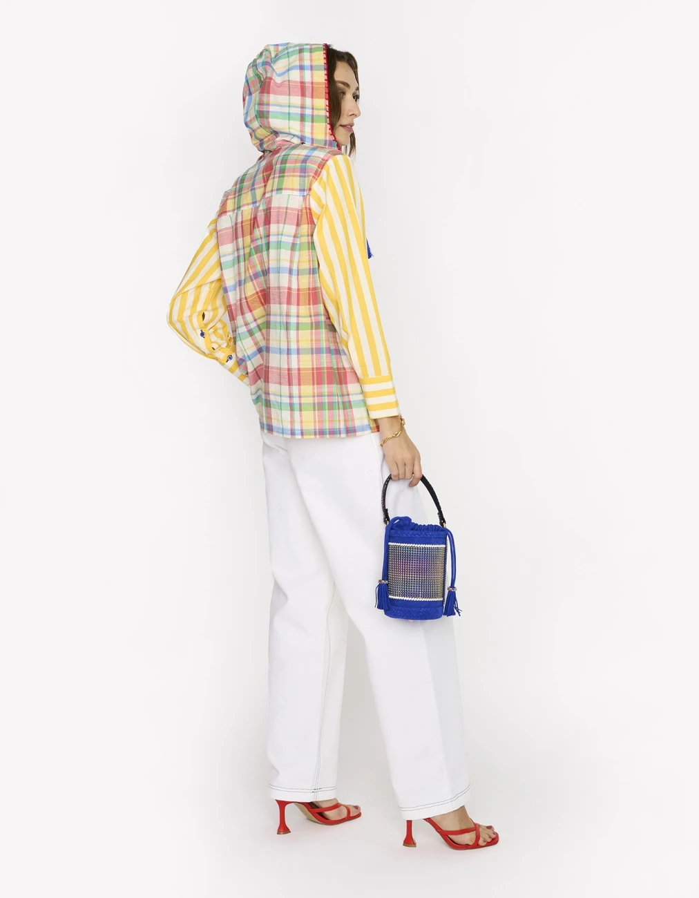 - The checks & striped hoodie top with hand embroidered yoke & pocket