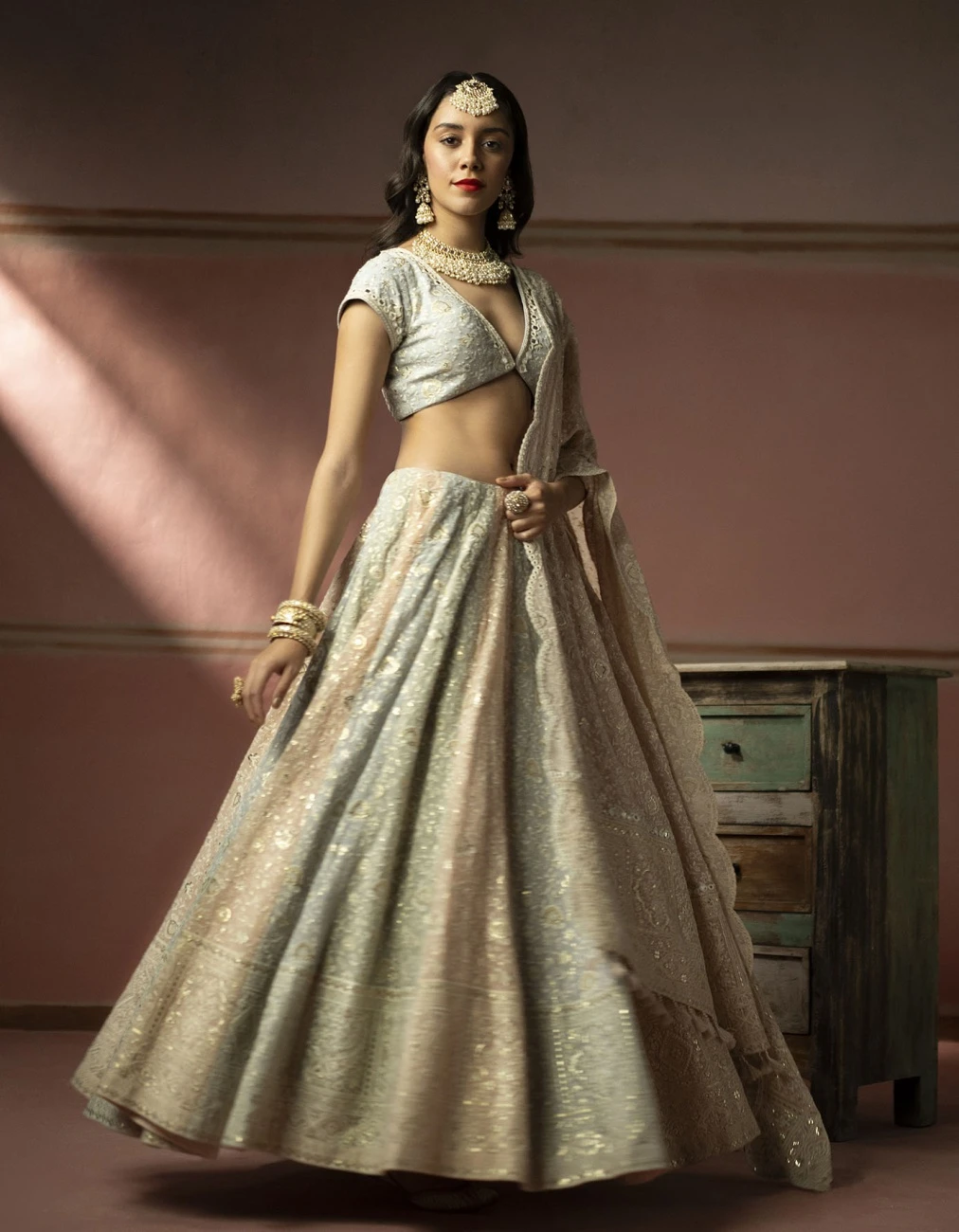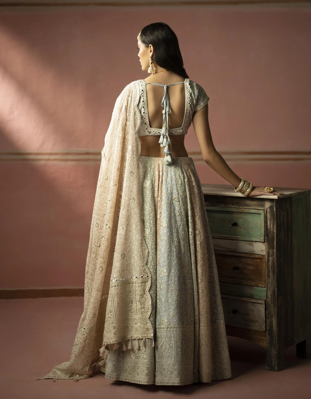 - The garment is made in Georgette, with Chikankari embroidery patterns designed, embroidered and embellished with mirrorwork