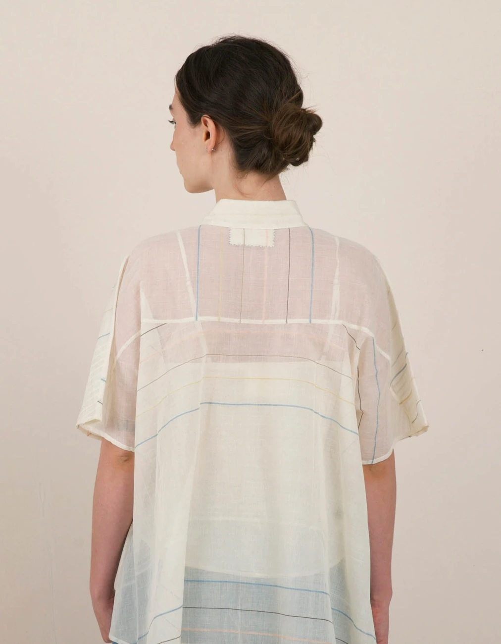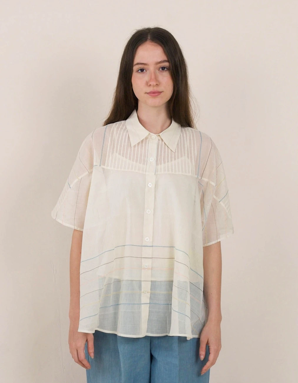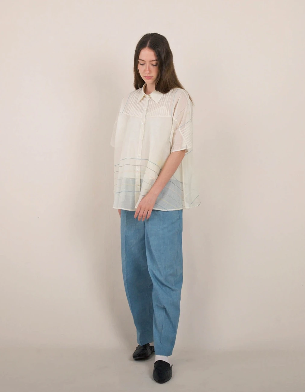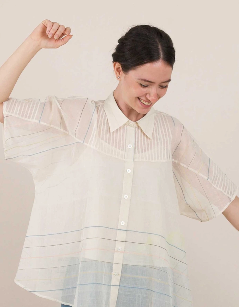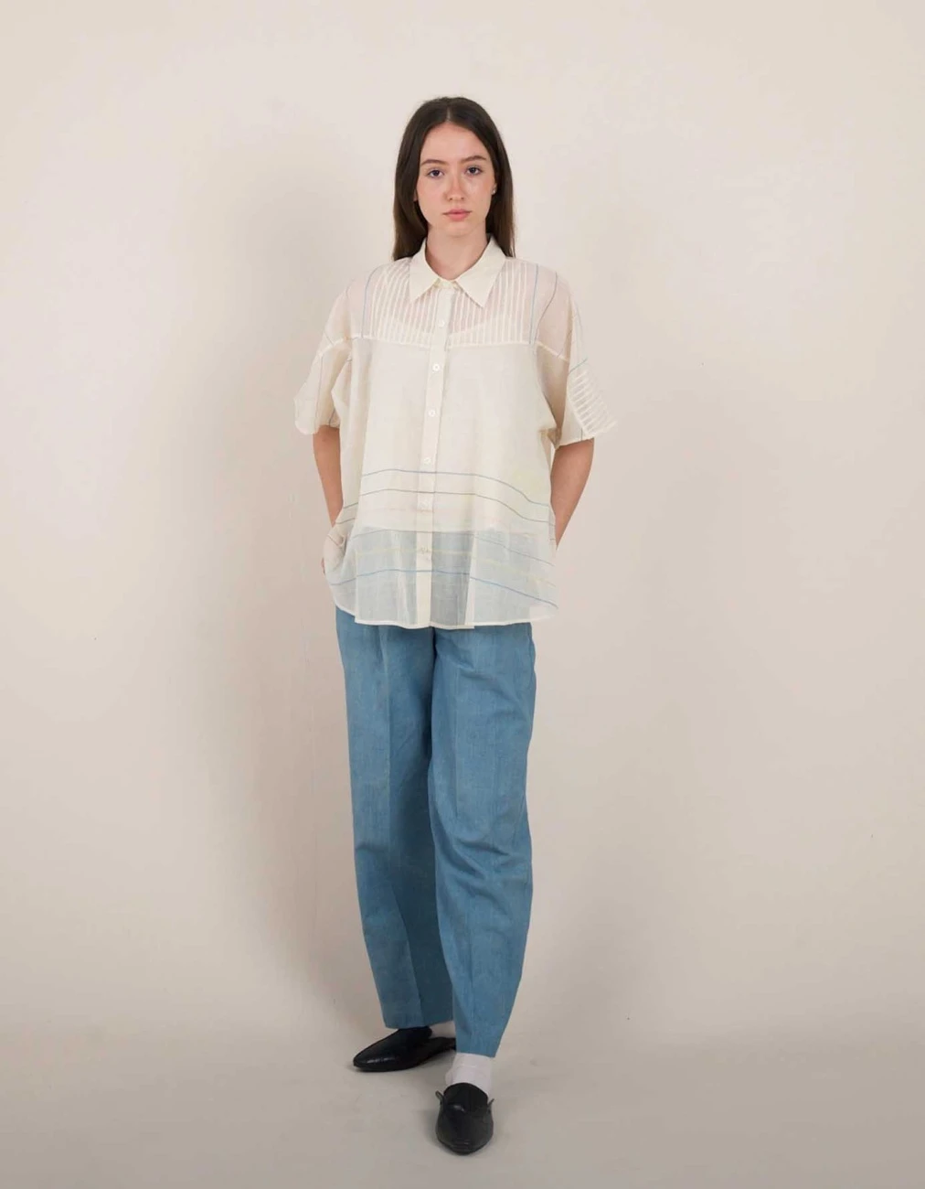 - A breezy semi-sheer dolman sleeve shirt with fine pintuck detailing in the front