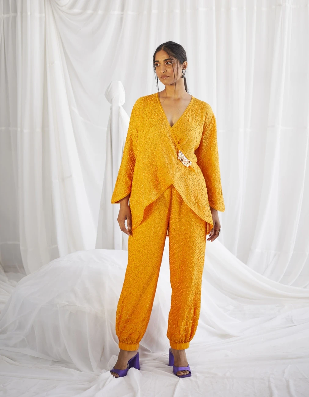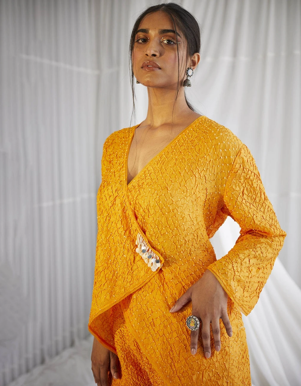 - Wrapover top with beads and mother of pearls tassles in crushed raidaana bandhani