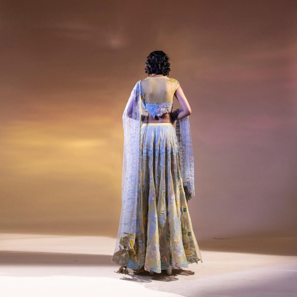 Abhishek Sharma’s fresh-off-the-runway collection features unconventional drapes with printed textures
