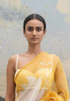 - “Kokino” khadi bralet blouse in in white features a polka print in yellow a with strappy back